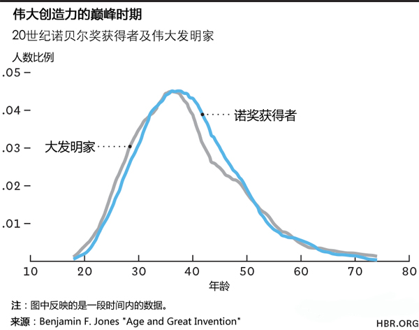 首先,我们来看看研究结果。在2010年的一篇论文中,美国西北大学的本杰明•琼斯研究了20世纪诺贝尔获奖者和伟大发明家的年龄,发现年龄和创造力的关系和伊曼纽尔描述的一致。
